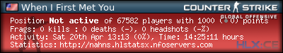 | 1 | When I First Met You | 0d 00:00:01h | 2019-04-20 13:19:47 | 0 | 0 | 0.00 | 0 | - | 0 | 0.0% |